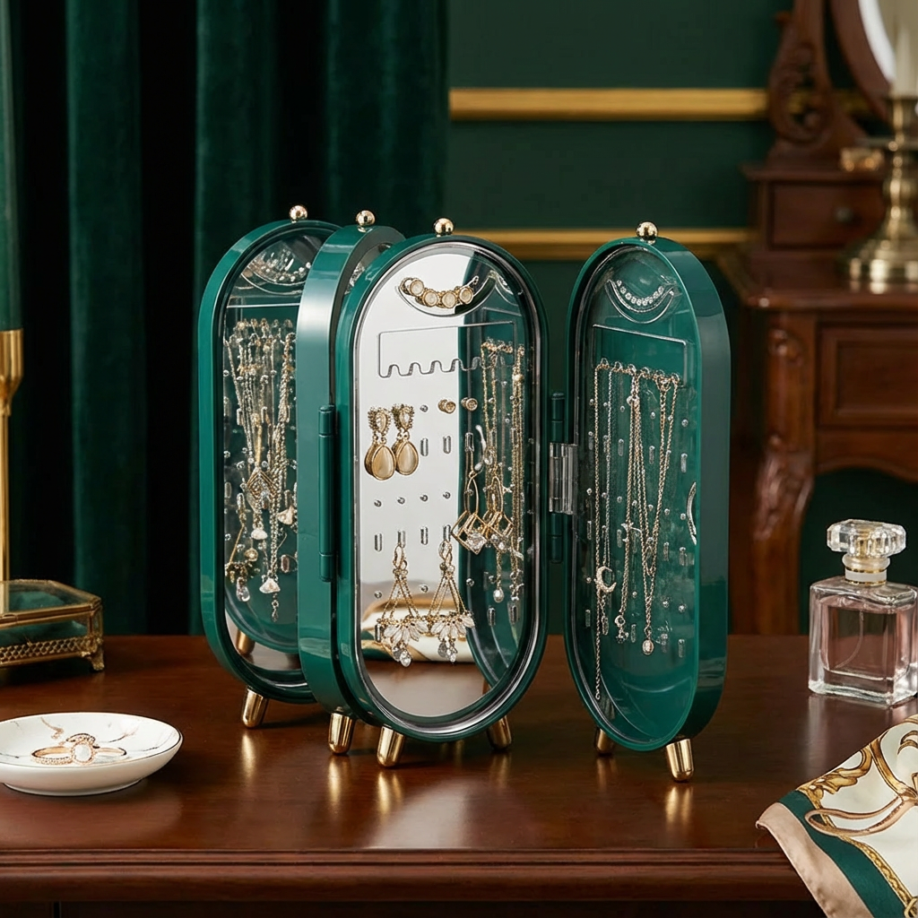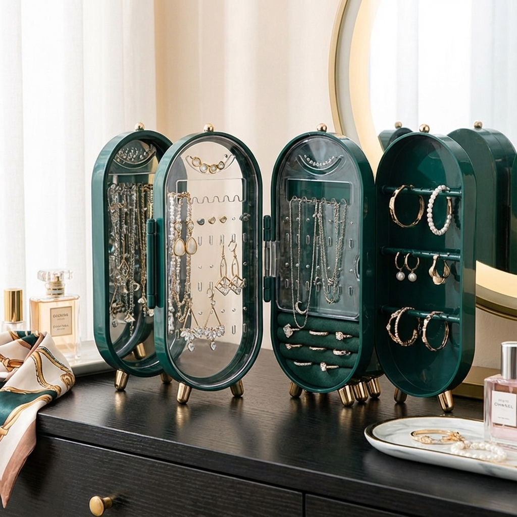 JewelCase™ er et stående smykkeskrin med integreret spejl, designet til at give hvert smykke sin egen plads.