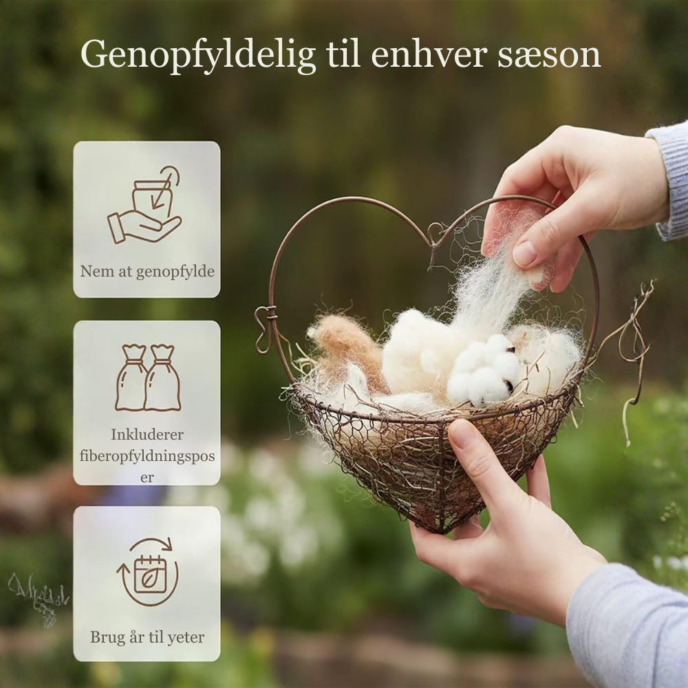 NestHeart er fyldt med naturlig alpakauld, som fugle instinktivt bruger til at isolere deres reder. Den dekorative hjerteform gør det let at hænge NestHeart i haven, på altanen eller i et træ, hvor fuglene frit kan hente ulden.