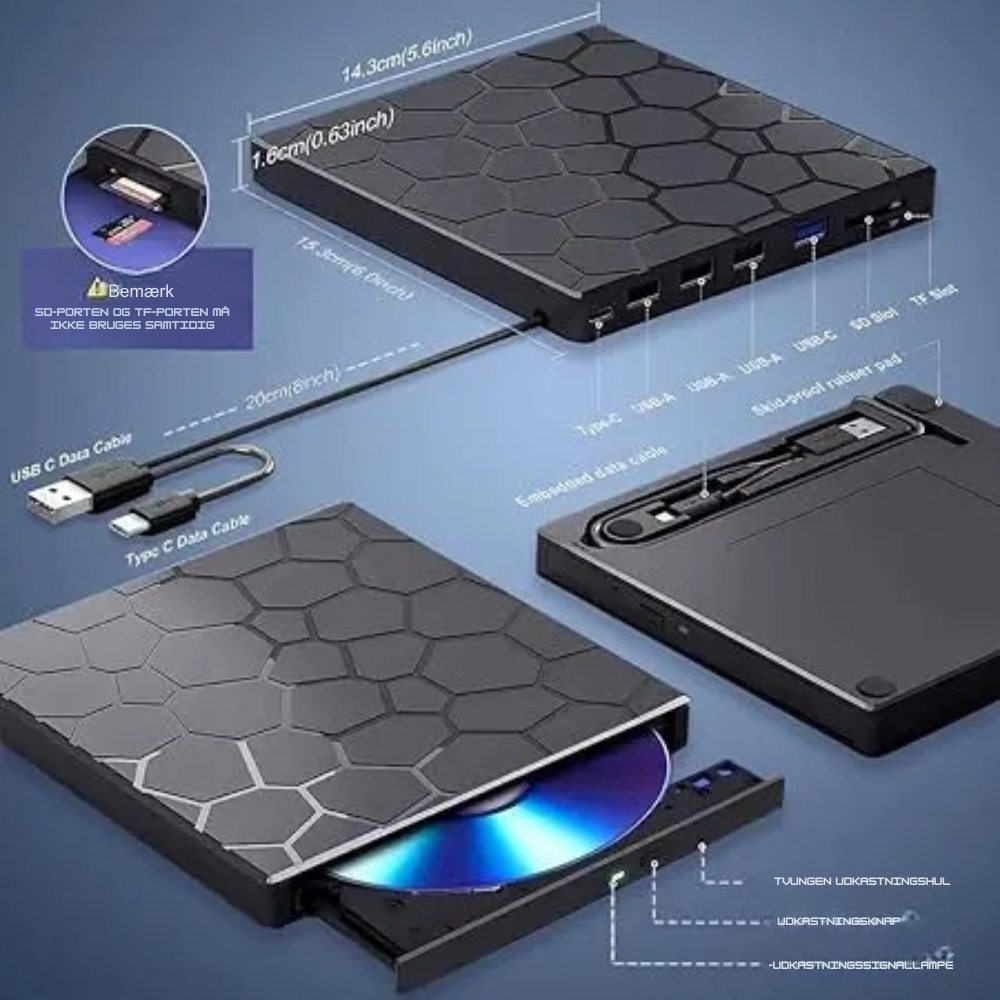 OptiDrive er et 8-i-1 eksternt CD/DVD-drev, der giver dig mulighed for at afspille, brænde, kopiere og gemme film, musik og billeder direkte på din computer. Tilslut via USB, og du er klar på få sekunder — helt uden installation.