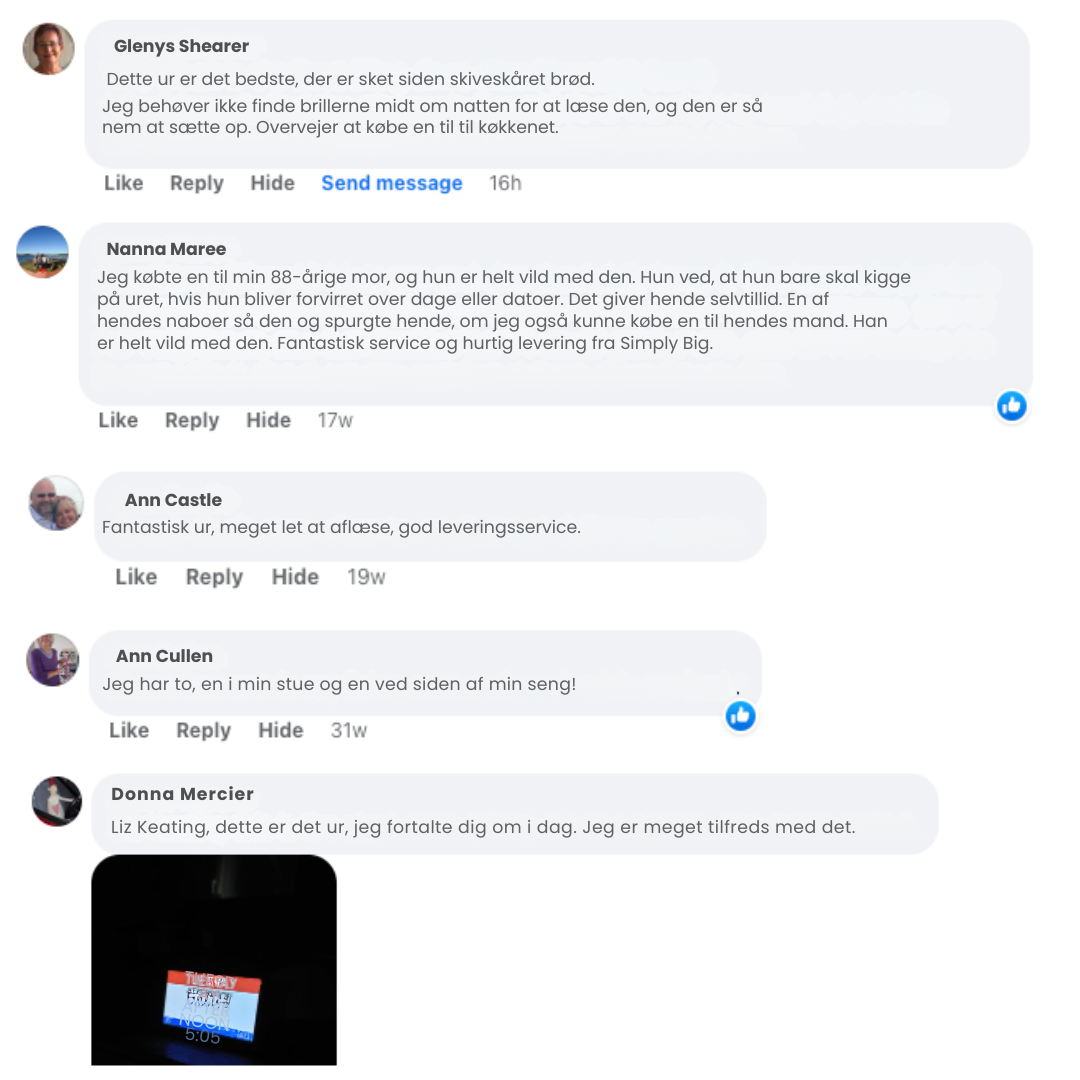 ReminderClock™ er her for at skabe ro og struktur – med tydelig skærm, store tal og op til 40 daglige påmindelser, skræddersyet til behovet. Den fungerer intuitivt, selv for dem med hukommelsesudfordringer, demens eller nedsat syn.