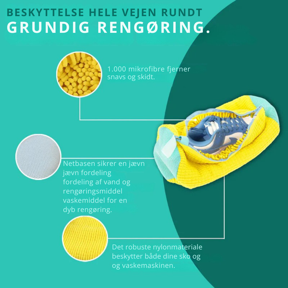 Shoebag™ er den ultimative løsning til at vaske dine sko sikkert og nemt. Med mere end 1.000 bløde børstehår fjerner denne vaskepose op til 99 % af snavs og pletter, samtidig med at den forhindrer skader og deformation.