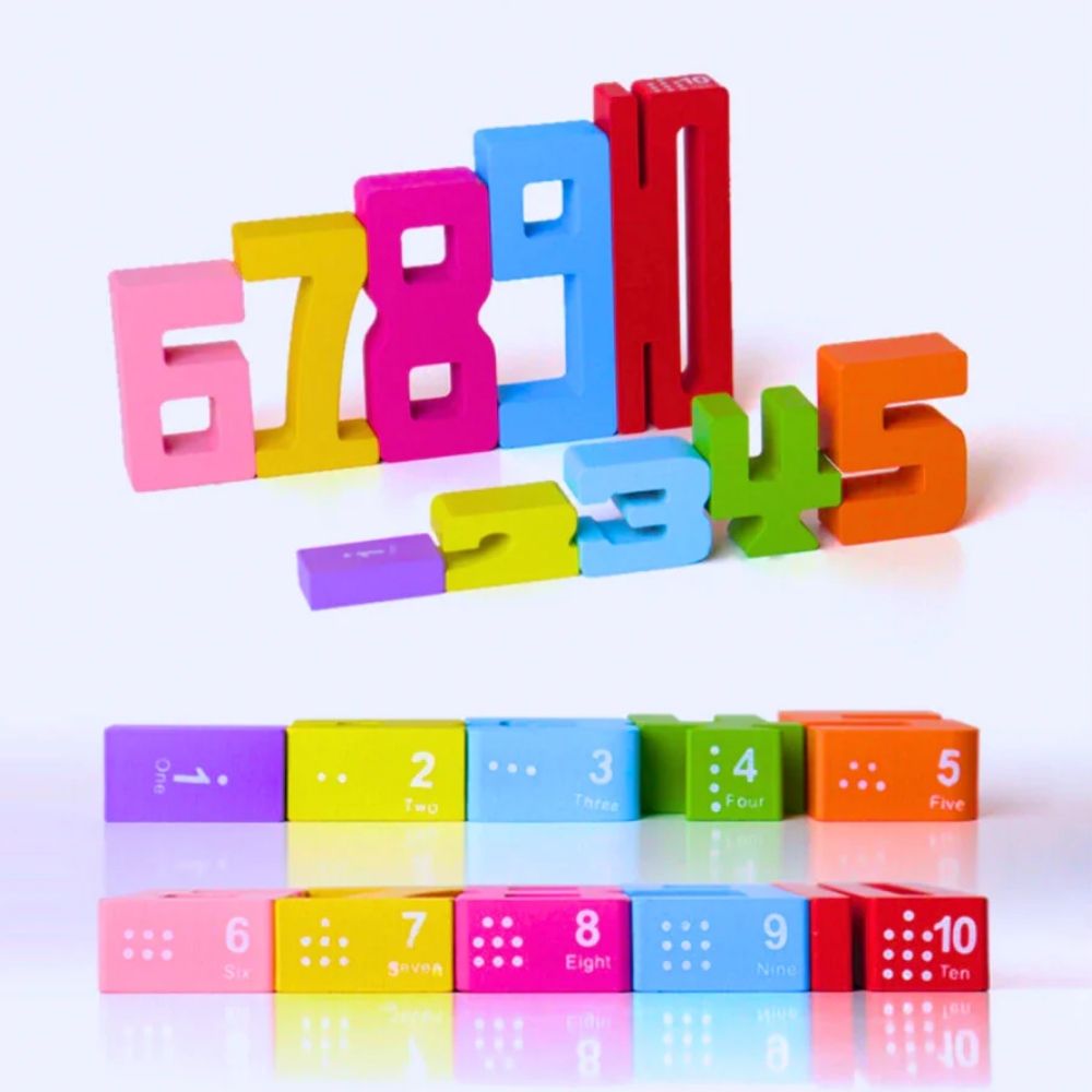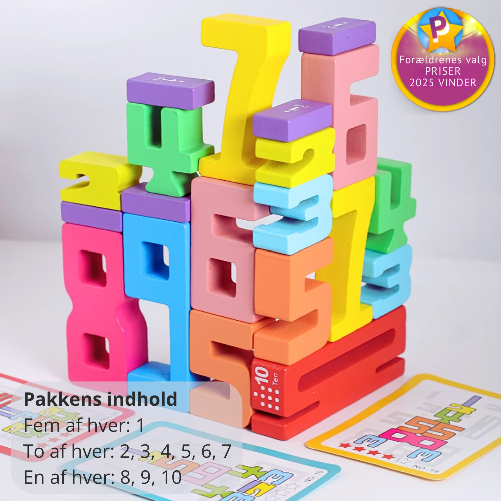 Med SumBlocks™ bliver matematik noget, børnene kan se og røre ved. Hver klods har forskellig højde – så når de stabler for eksempel en 2’er og en 3’er, bliver det præcis samme højde som en 5’er. Det gør talforståelsen konkret, visuel og sjov.