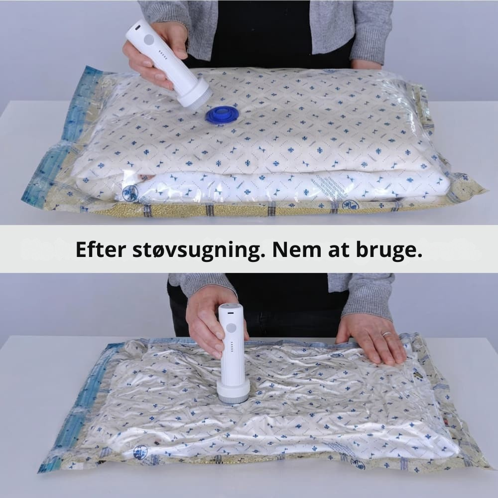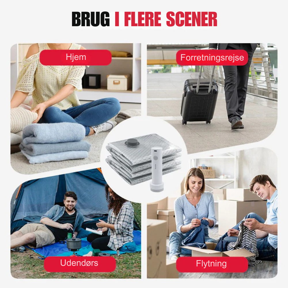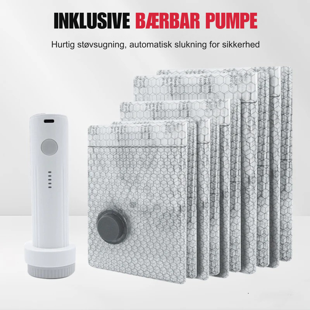VacuPack består af genanvendelige vakuumposer og en elektrisk pumpe, som hurtigt fjerner luften fra tøjet. Når luften suges ud, bliver tøjstykkerne flade og kompakte, så de fylder markant mindre i kufferten. På få sekunder kan du organisere dit tøj bedre og skabe langt mere plads til resten af din bagage.