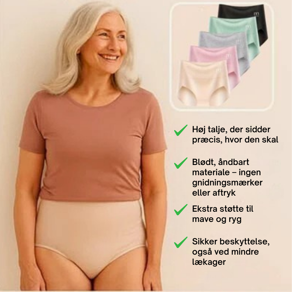 Udover at give masser af støtte er dette undertøj også ideelt under din menstruation. Takket være den tredobbelte konstruktion giver det ekstra beskyttelse og holder dig tør og komfortabel hele dagen. Det forhindrer uønsket lækage, så du kan føle dig sikker, samtidig med at du får den støtte og komfort, du har brug for. Perfekt til at kombinere funktionalitet med komfort!