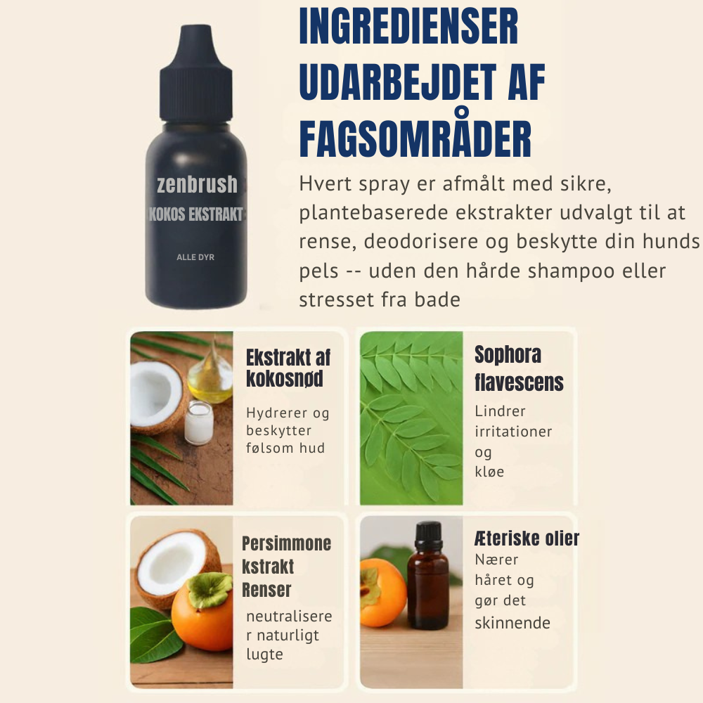 ZenBrush anvendes som en skånsom mellem-pleje, særligt velegnet til hunde, der oplever stress ved bad, eller som har behov for hyppig, mild pelspleje uden at belaste hudens naturlige balance.